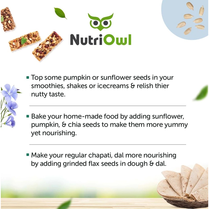 NutriOwl's premium sunflower seeds are a delicious and nutritious addition to any healthy diet. Sourced from the best growers and minimally processed to preserve their natural goodness, these seeds are a great source of protein, healthy fats, fibre, and essential minerals like magnesium and selenium.