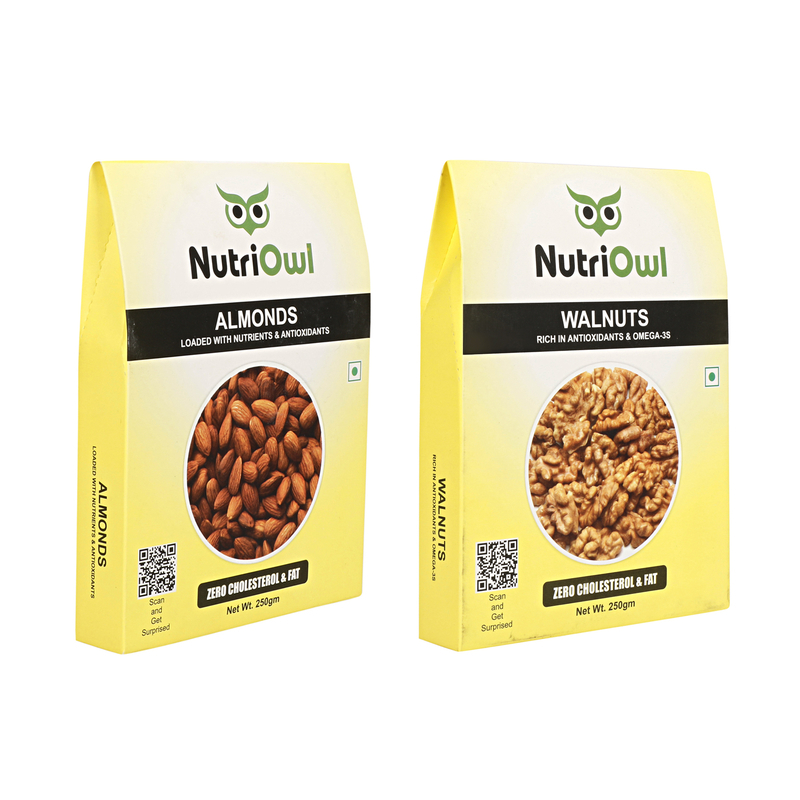 NutriOwl Dry Fruit Combo presents a delightful pairing of two premium dry fruits: California Almonds and Walnuts. This combo offers a delicious and nutritious snacking experience, providing you with the goodness of these wholesome nuts.