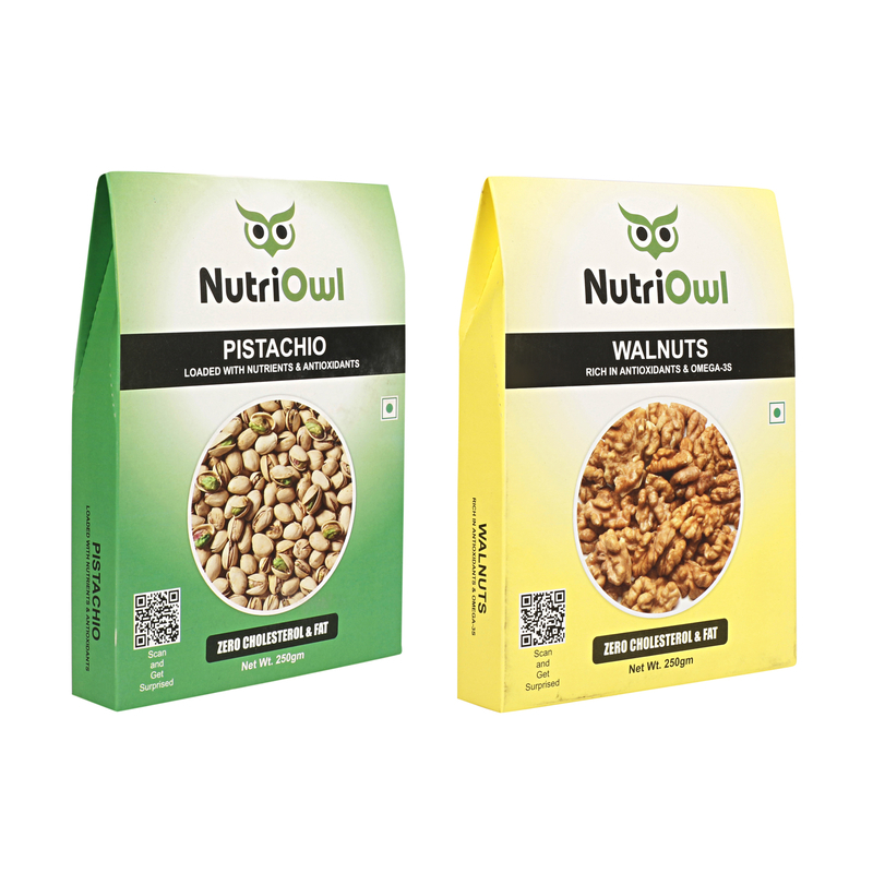 NutriOwl Dry Fruit Combo combines the rich flavours and nutritional goodness of California walnuts and pistachios. This delightful blend of two premium dry fruits offers a delectable snacking experience while providing a range of health benefits.